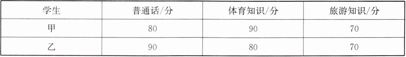 6. 学校要从甲、乙两名学生中选拔一人参加运动会志愿者工作,选拔项目为普通话、体育知识和旅游知识,并将成绩依次按$4:3:3$计分.两人的各项选拔成绩如下表: