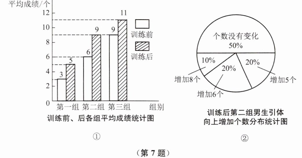 7. 某校部分男生分3组进行引体向上训练,对训练前、后的成绩进行统计分析,相应数据的统计图如下: