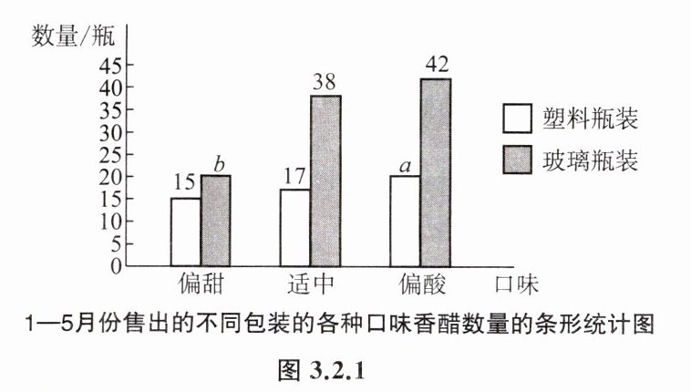 例2 香醋中有一种物质,其含量不同,口味就不同,不同口味的香醋中该种物质的含量如下表.小明调查了某超市销售不同包装(塑料瓶装和玻璃瓶装)的三种口味的香醋,并将该超市1—5月份售出的香醋数量绘制成如下条形统计图(图3.2.1).