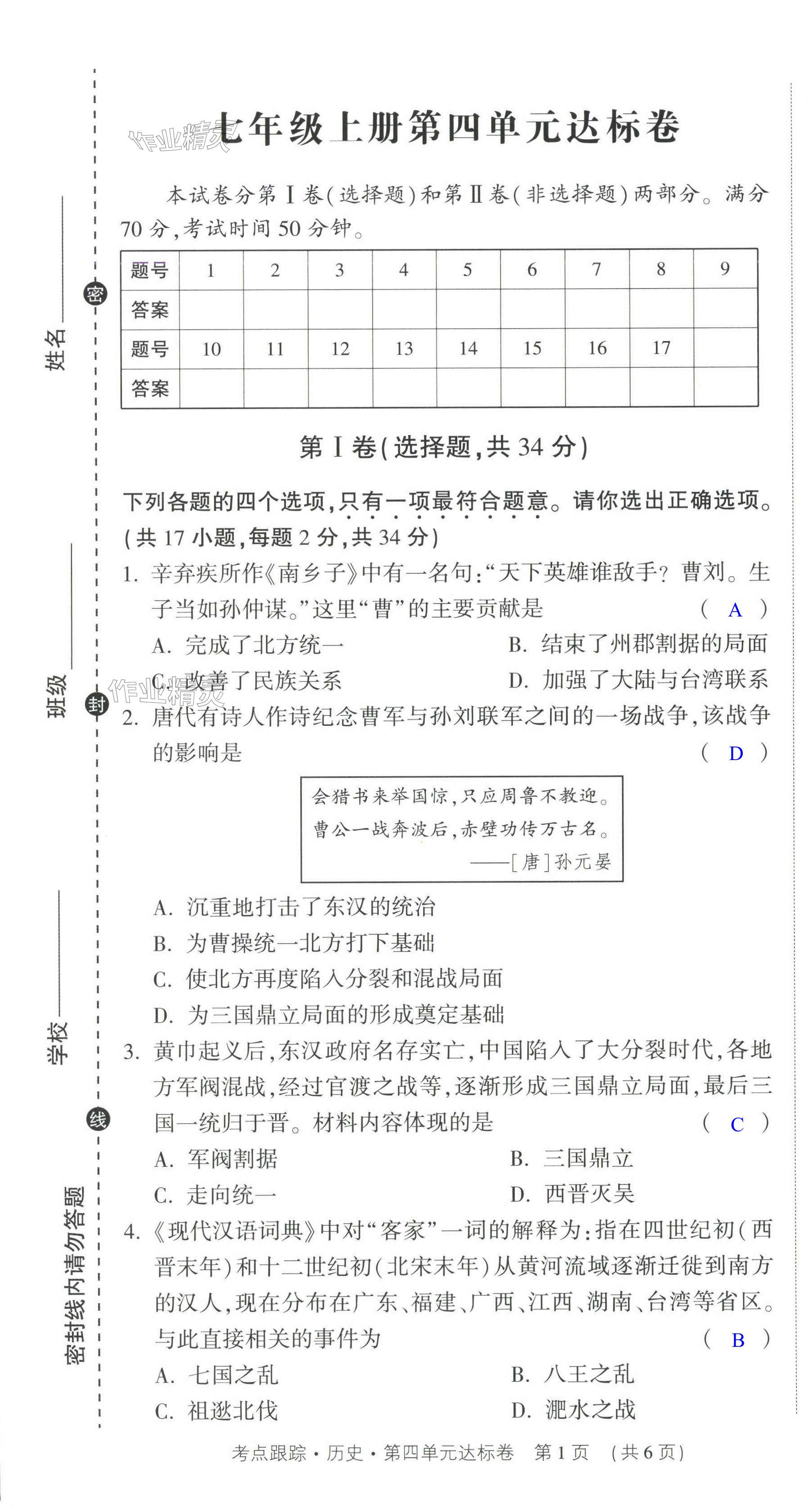 注:目前有些书本章节名称可能整理的还不是很完善,但都是按照顺序排列的,请同学们按照顺序仔细查找。练习册 2024年考点跟踪同步训练七年级历史上册人教版深圳专版 答案主要是用来给同学们做完题方便对答案用的,请勿直接抄袭。