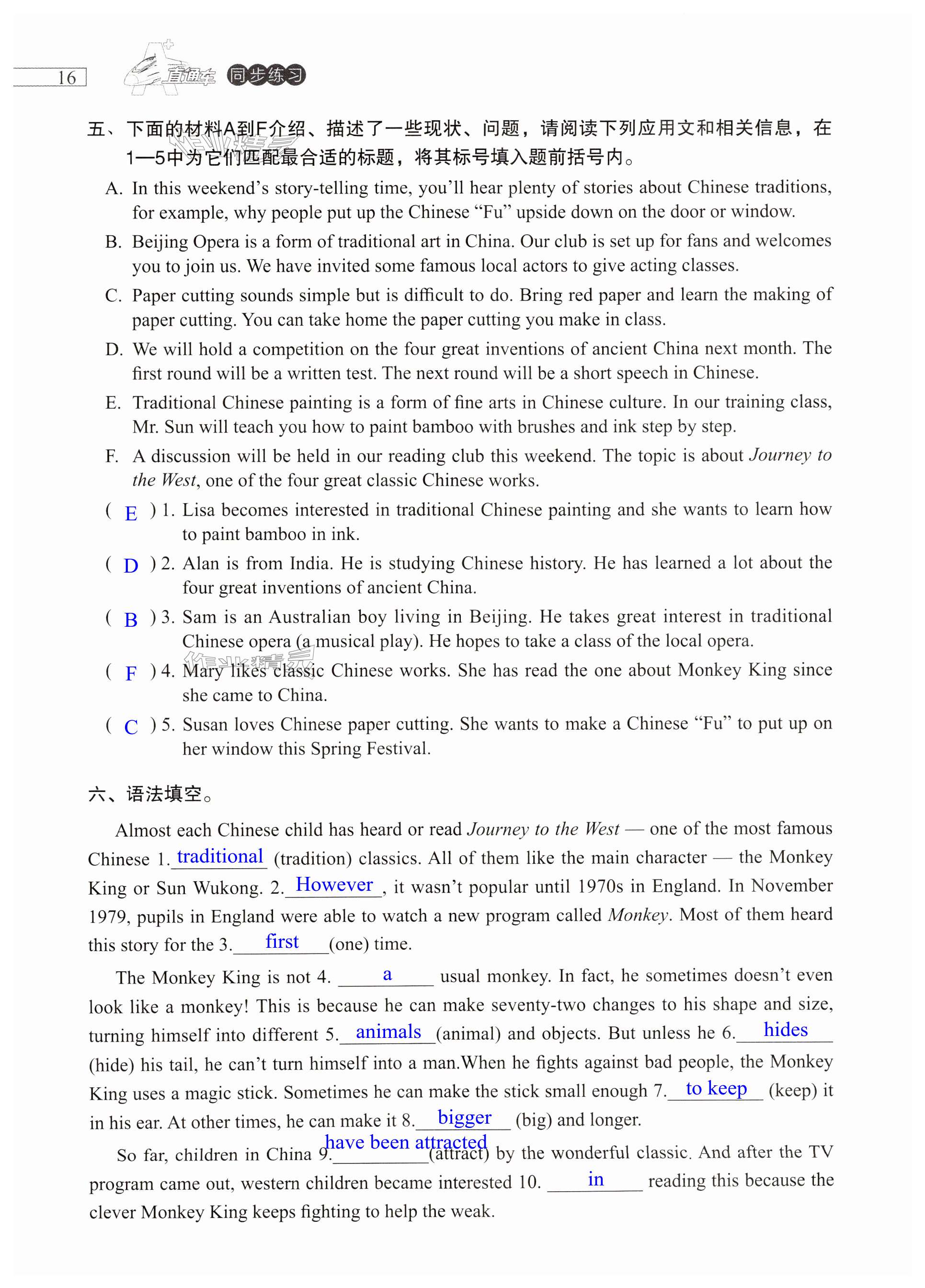 注:目前有些书本章节名称可能整理的还不是很完善,但都是按照顺序排列的,请同学们按照顺序仔细查找。练习册 2024年A加直通车同步练习九年级英语全一册沪教版 答案主要是用来给同学们做完题方便对答案用的,请勿直接抄袭。
