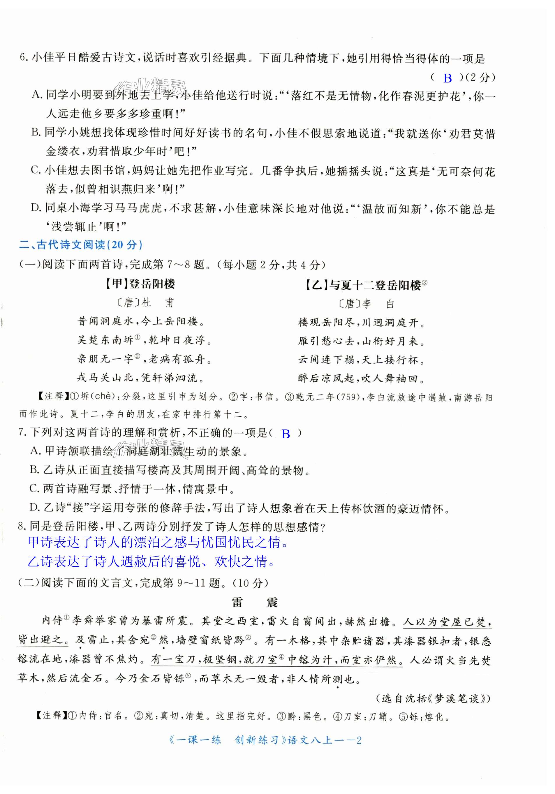 注:目前有些书本章节名称可能整理的还不是很完善,但都是按照顺序排列的,请同学们按照顺序仔细查找。练习册 2024年一课一练创新练习八年级语文上册人教版 答案主要是用来给同学们做完题方便对答案用的,请勿直接抄袭。