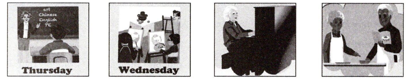 Hello, I'm John. Look ______ my picture. I have ______, English and music ______ Thursdays. I love music and my music ______ is Mr Young. He's not ______. And he is ______.
