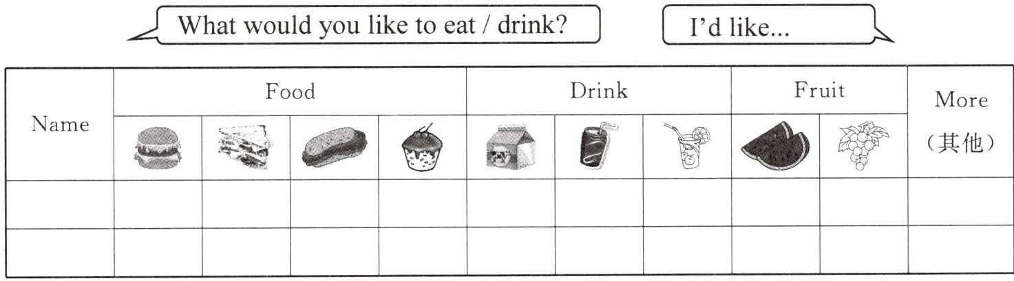 三、做个小调查:下午茶起源于17世纪的英国。英国人一般会在下午4点至6点享受这顿简餐。餐点包括三明治、松饼、蛋糕等,当然还少不了茶和咖啡哦!同学们,你想和小伙伴一起品尝下午茶吗?请你调查一下大家想要什么吧!