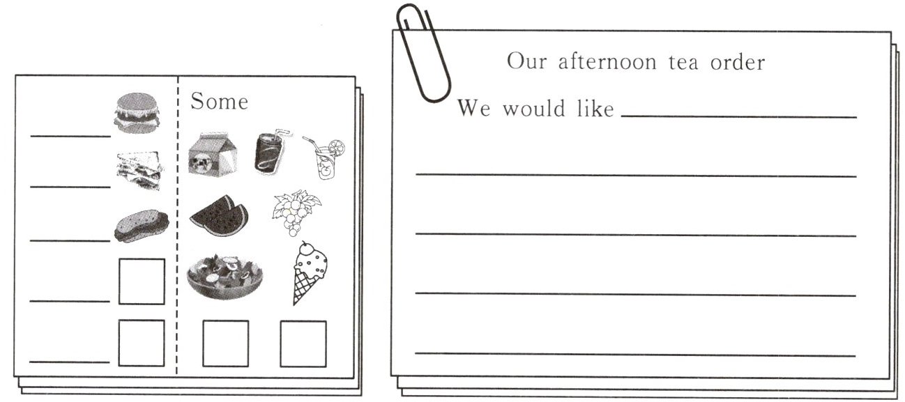 三、点餐。在上一页的练习中,我们询问了小伙伴想要的下午茶。请你统计一下数量,写在相应的横线上,方框中可补充其他食物。然后写一写。