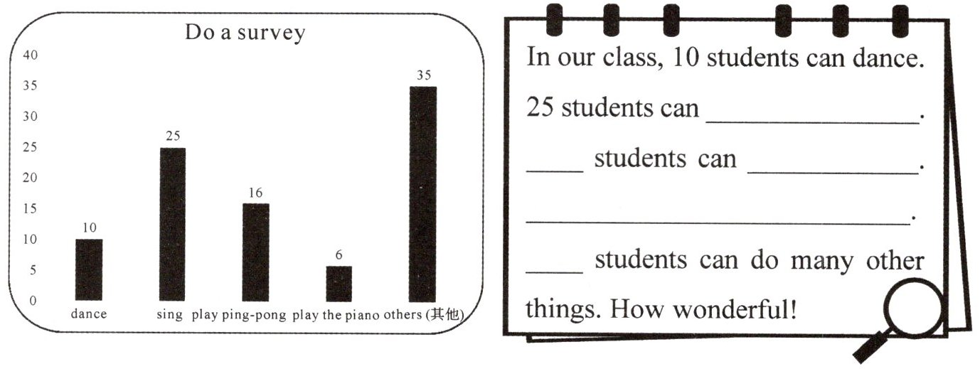 三、根据图表,仿照例句,完成调查报告,并尝试自己做一做。