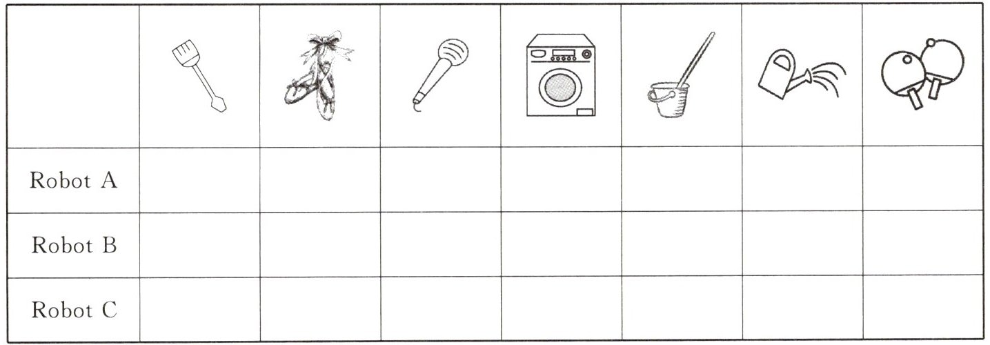 Robot A: I'm helpful. I can cook. I can clean the room. I can play ping-pong. I can water the flowers.