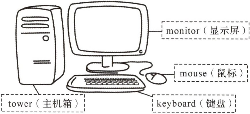 The computer is very useful (有用的). It can do many kinds of work. A computer is made up of many parts, including a monitor, a mouse, a keyboard, a tower, etc.