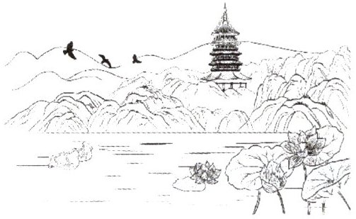 This picture of the West Lake is so beautiful. There are some birds in the sky.______