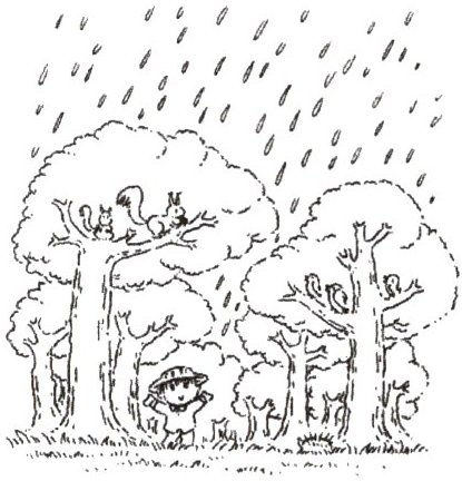 It is a rainy/sunny day. Tom wears a cap/hat and plays with the animals in the farm/forest. Look! The squirrels are jumping in the trees. Are there any birds/monkeys in the trees? No,there isn't/aren't. There are lovely birds. They are singing.