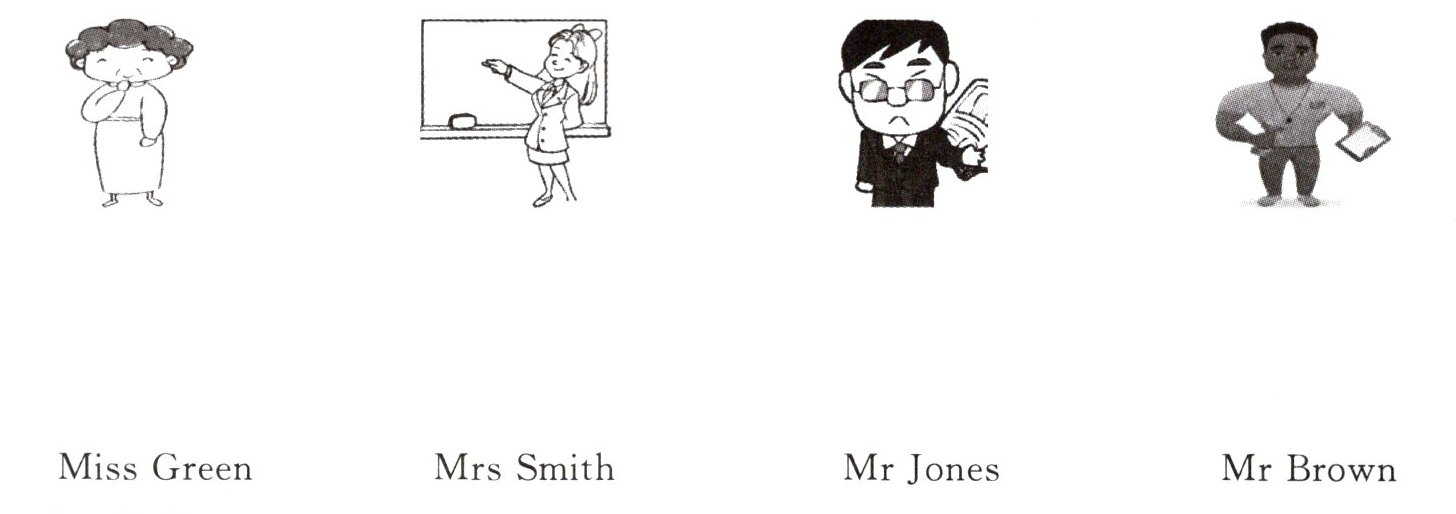 I have four new teachers. They're Miss Green, Mrs Smith, Mr Brown and Mr Jones. Miss Green is our science teacher. She's young. She has long hair. Mrs Smith teaches us computer. She is old. She's very kind. She often helps us. Mr Brown is our maths teacher. He wears glasses. What's he like? He's strict. Mr Jones is my favourite teacher. He's really funny. He often plays games with us in class. Oh, he is our PE teacher.