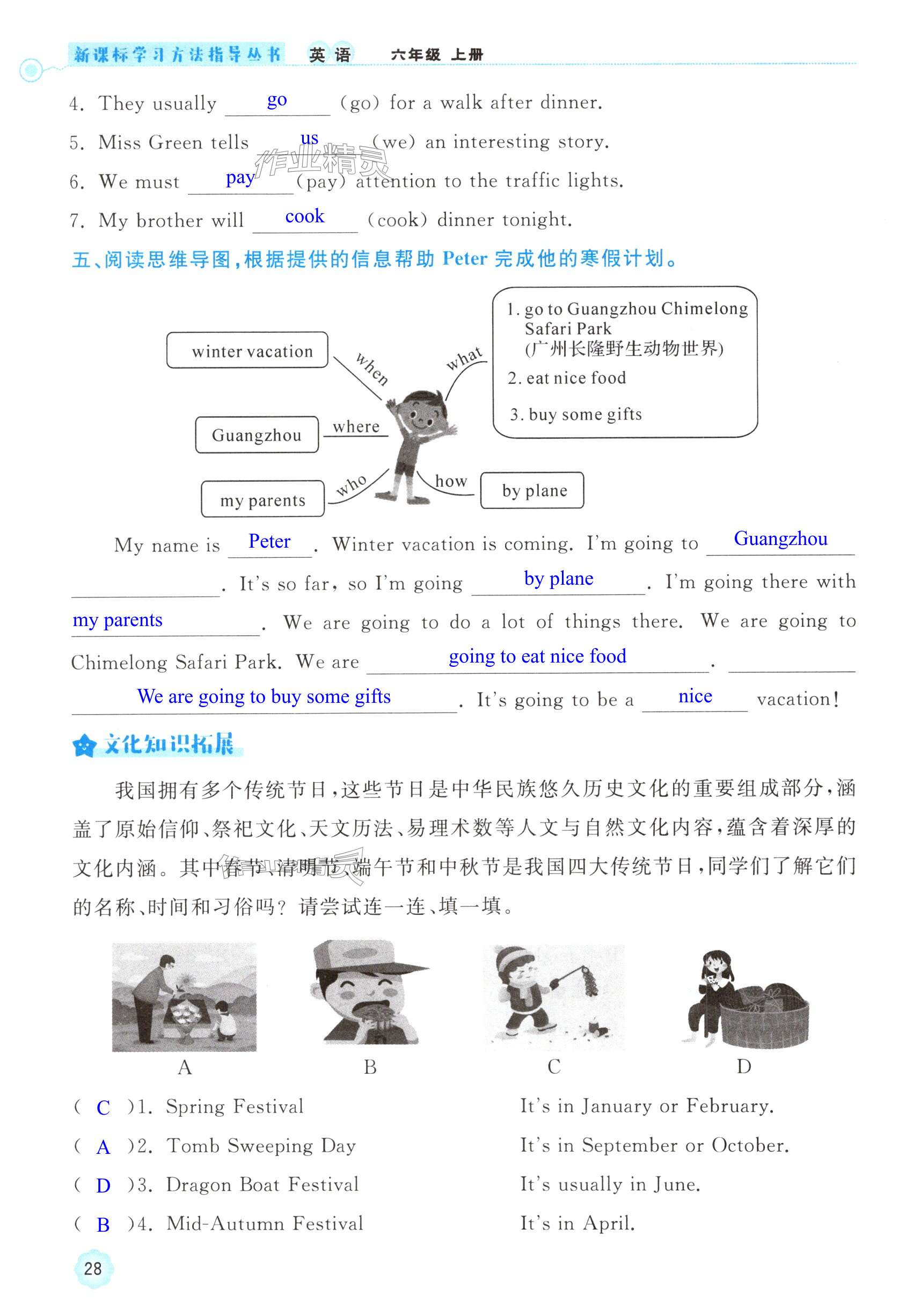 注:目前有些书本章节名称可能整理的还不是很完善,但都是按照顺序排列的,请同学们按照顺序仔细查找。练习册 2024年新课标学习方法指导丛书六年级英语上册人教版 答案主要是用来给同学们做完题方便对答案用的,请勿直接抄袭。