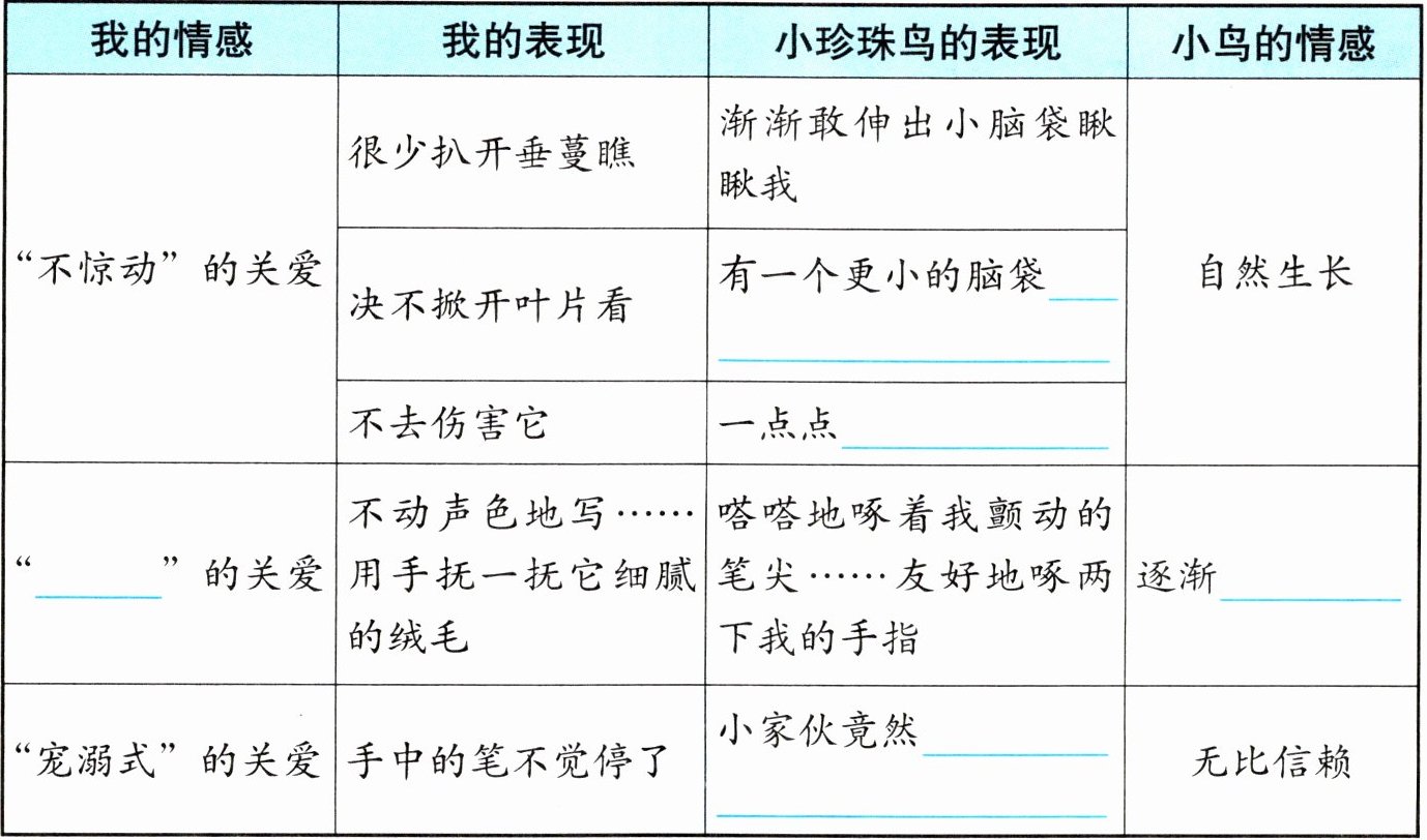 一、读课文,梳理我与小珍珠鸟的不同表现和情感变化,填写表格