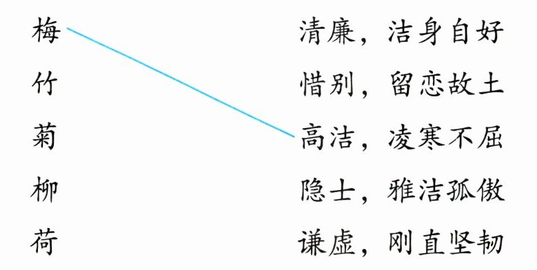 $\makecell{梅\\竹\\菊\\柳\\荷}\makecell{清廉,洁身自好\\惜别,留恋故土\\高洁,凌寒不屈\\隐士,雅洁孤傲\\谦虚,刚直坚韧}$