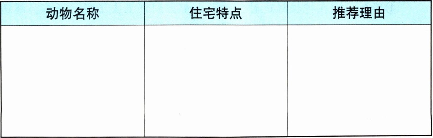 二、森林里准备举办一场“动物之家”展览会,蚂蚁、蜜蜂、蝈蝈等动物纷纷报名。你会推荐哪个动物的家参展?请你填写推荐卡(课内的动物除外)