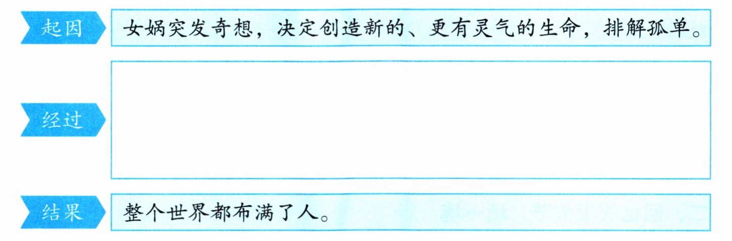 ③女娲心中充满温暖,兴奋激动,捏出一个又一个的泥娃娃,日复一日,夜复一夜,疲劳不堪。女娲停下手来,想了想,终于找到一个省事的办法。她从山崖摘下几根藤条,编成一根神奇的绳子,把绳子的一头抛到水中,一头牵在手上,然后用力一挥,搅浑了水中的泥浆,再使劲一抖,顿时,满河的泥浆四处飞溅,泥点落到哪里,哪里就跳出一个个、一群群的活人。没过多长时间,整个世界都布满了人。