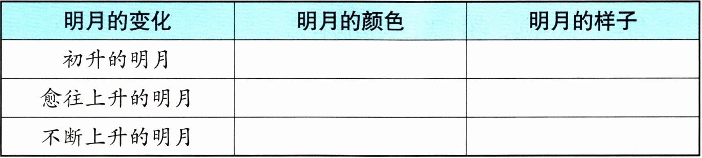 1. 作者在文中细致描写了海上月升时的变化和美态,请用关键词填写表格。