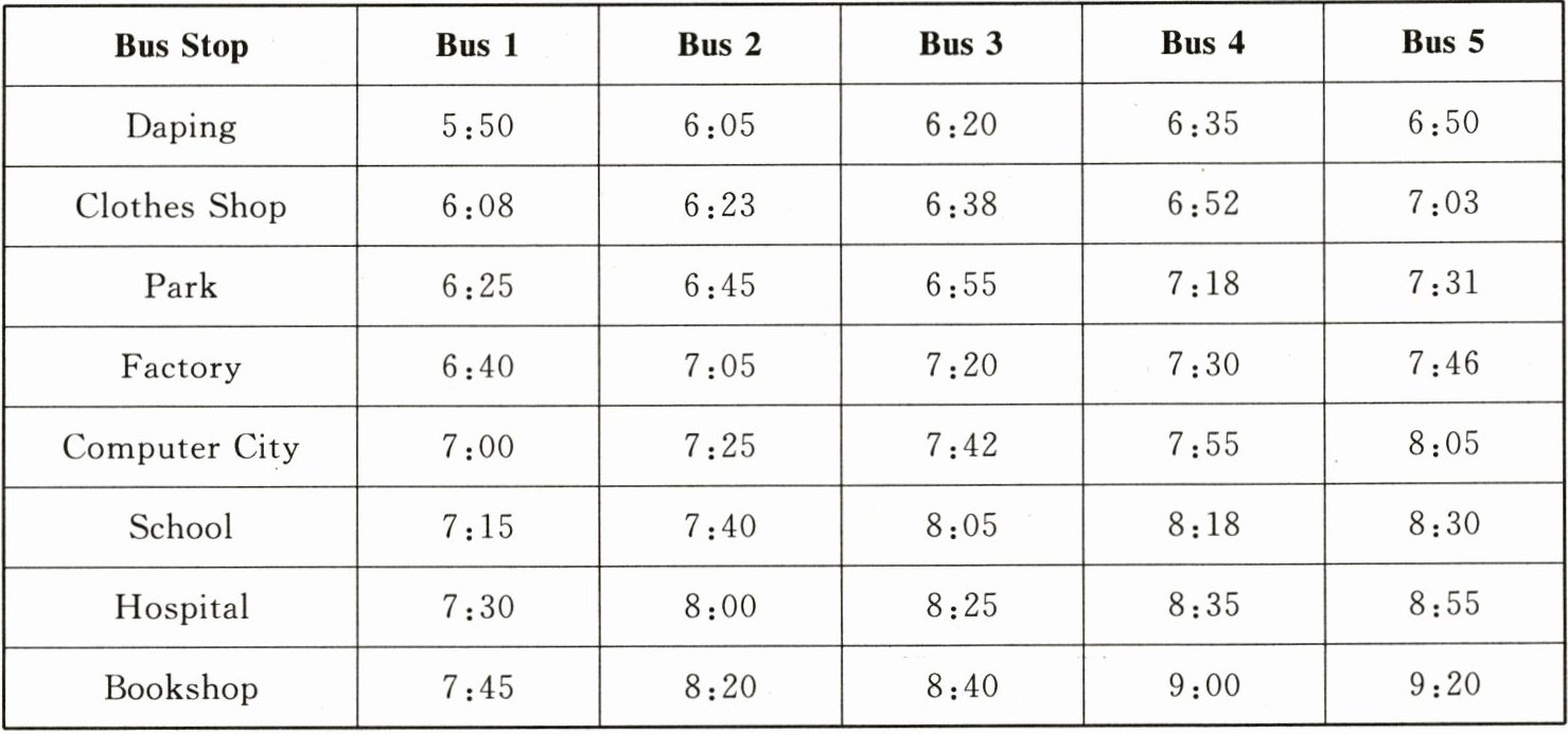 ( ) 3. What time should you get on the bus if you live near the factory and want to buy some books at nine o'clock?