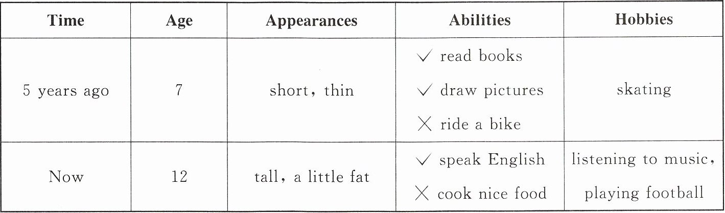 | Now | 12 | tall,a little fat | √ speak English × cook nice food | listening to music,playing football |