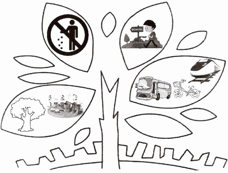 We should put rubbish in the bin. We can take the bus to school. We can walk to school