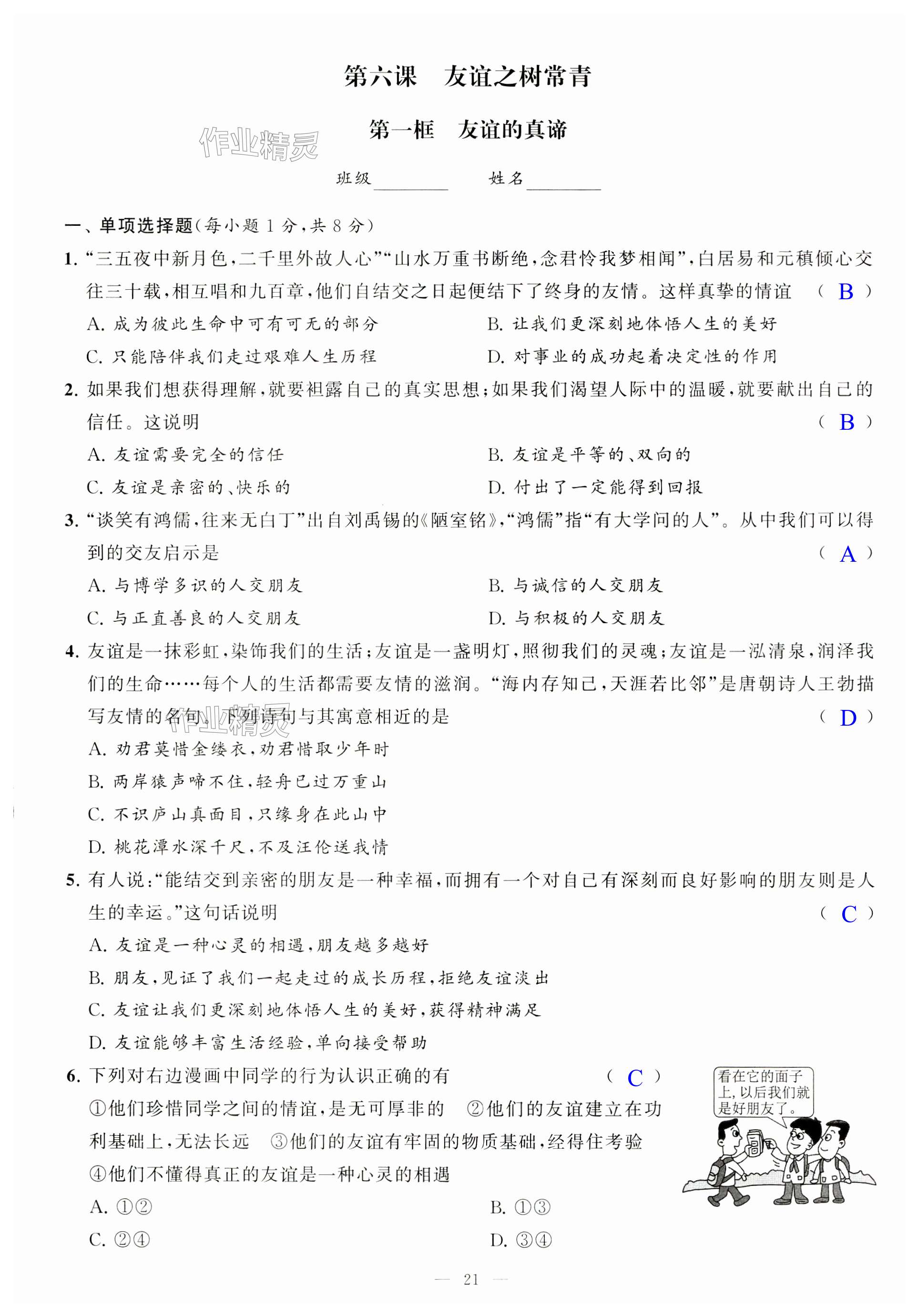 注:目前有些书本章节名称可能整理的还不是很完善,但都是按照顺序排列的,请同学们按照顺序仔细查找。练习册 2024年智慧学习初中学科单元试卷七年级道德与法治上册人教版 答案主要是用来给同学们做完题方便对答案用的,请勿直接抄袭。