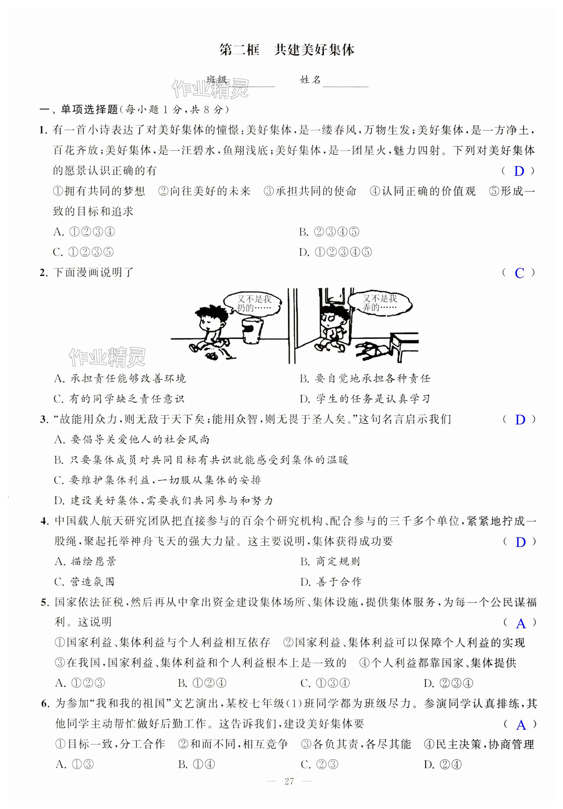 注:目前有些书本章节名称可能整理的还不是很完善,但都是按照顺序排列的,请同学们按照顺序仔细查找。练习册 2024年智慧学习初中学科单元试卷七年级道德与法治上册人教版 答案主要是用来给同学们做完题方便对答案用的,请勿直接抄袭。