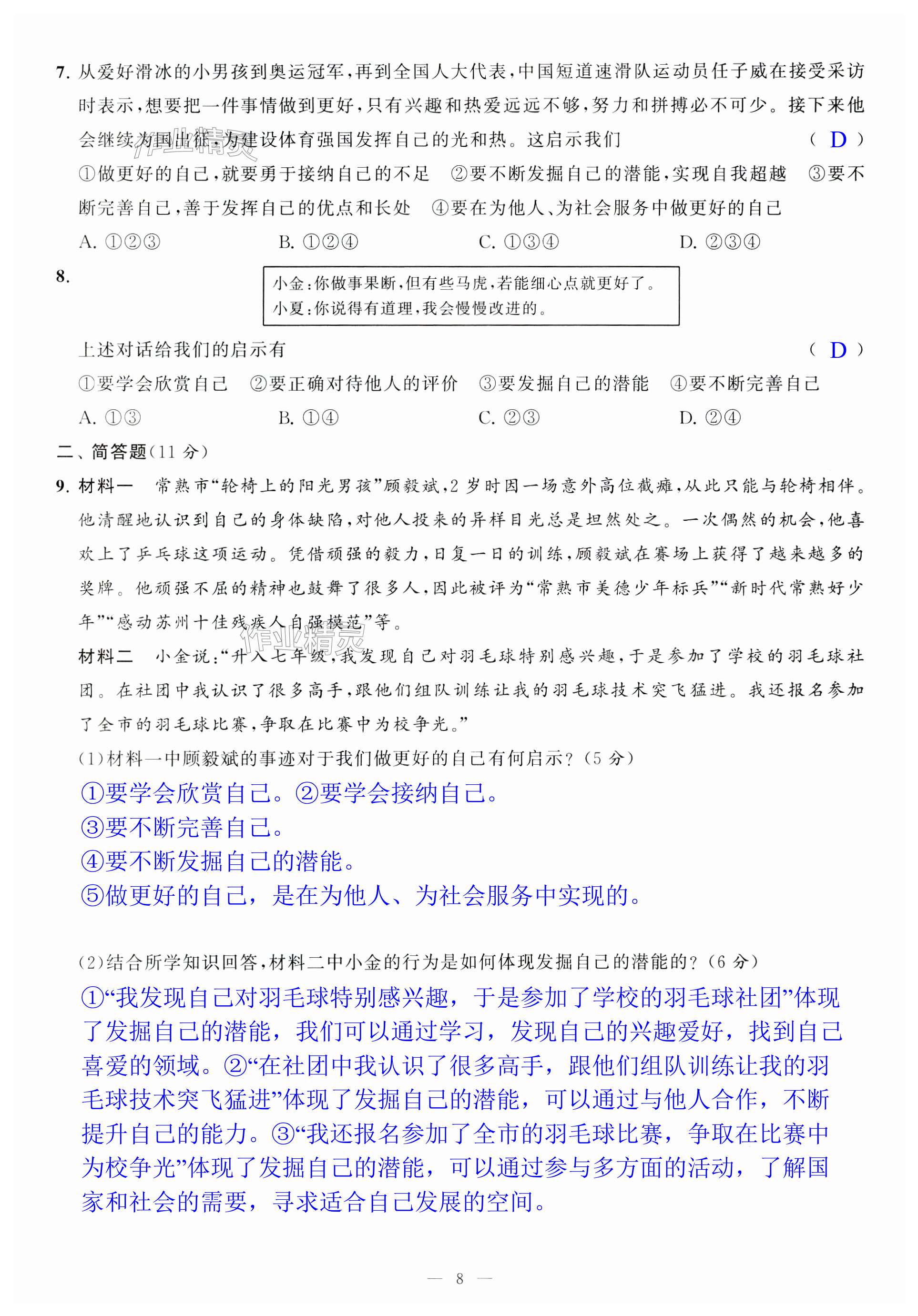 注:目前有些书本章节名称可能整理的还不是很完善,但都是按照顺序排列的,请同学们按照顺序仔细查找。练习册 2024年智慧学习初中学科单元试卷七年级道德与法治上册人教版 答案主要是用来给同学们做完题方便对答案用的,请勿直接抄袭。