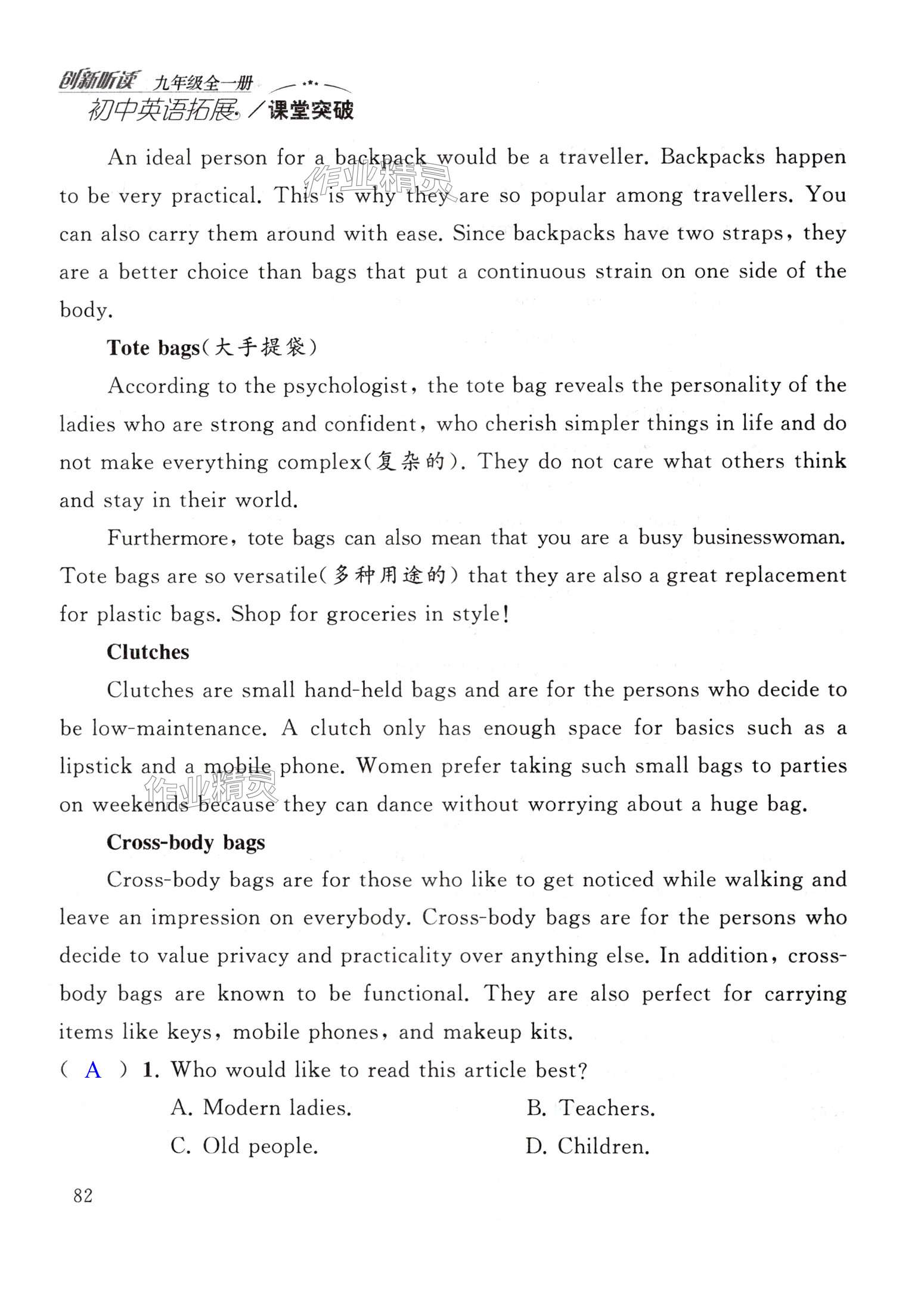 注:目前有些书本章节名称可能整理的还不是很完善,但都是按照顺序排列的,请同学们按照顺序仔细查找。练习册 2024年初中英语拓展课堂突破九年级全一册译林版 答案主要是用来给同学们做完题方便对答案用的,请勿直接抄袭。