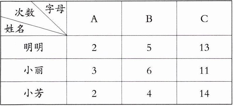 6. 有一个正方体木块,1面写着A,2面写着B,3面写着C。3名同学每人抛20次,统计情况如下。