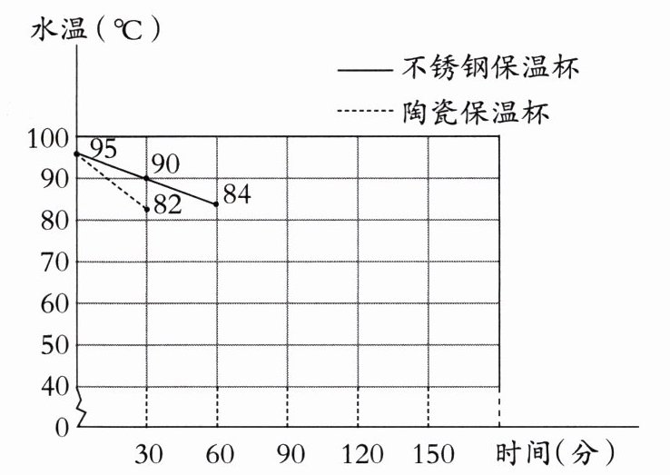 (2)30分钟时,不锈钢保温杯里的水温是( ),陶瓷保温杯里的水温是( )。