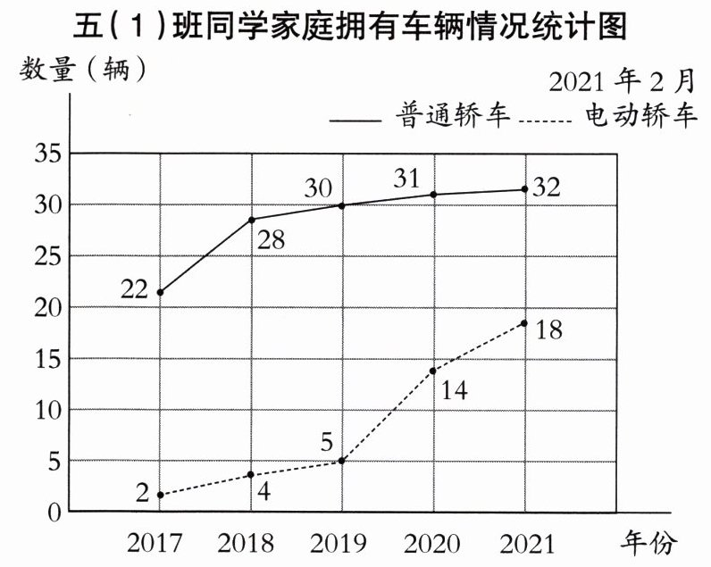 (2)2018年普通轿车比电动轿车多( )辆,2020年电动轿车比普通轿车少( )辆。