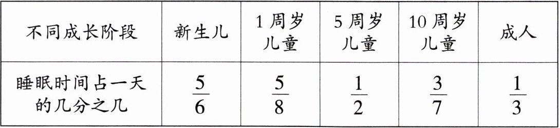 |睡眠时间占一天的几分之几|$\frac{5}{6}$|$\frac{5}{8}$|$\frac{1}{2}$|$\frac{3}{7}$|$\frac{1}{3}$|
