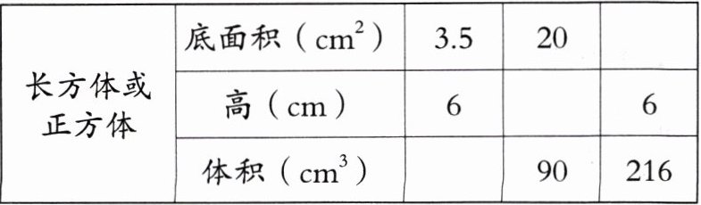 | 长方体或正方体 | 底面积$ (cm^2) $| 高 (cm) | 体积$ (cm^3) $|