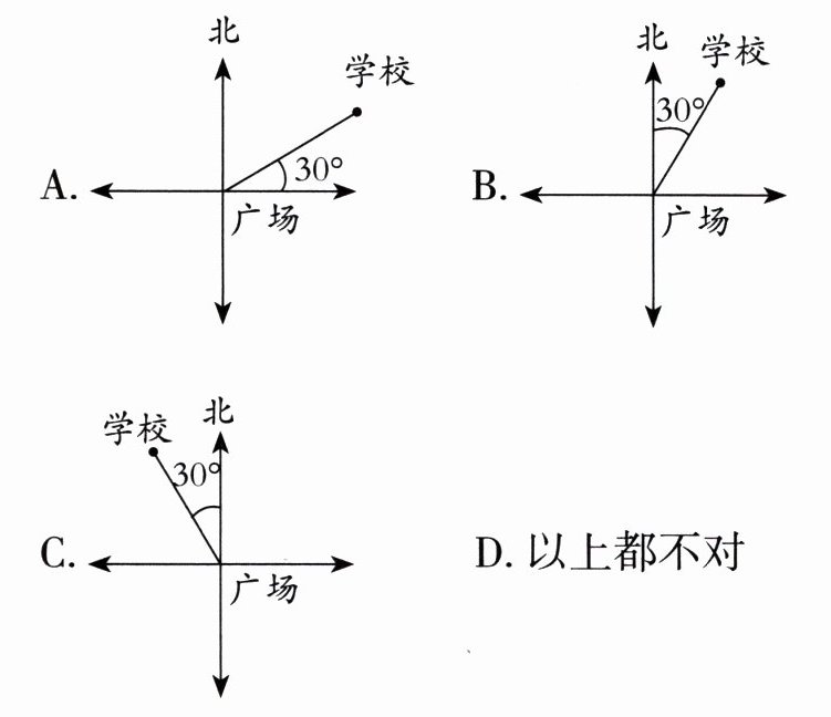 (1)以广场为观测点,学校在北偏西$30^\circ$方向上。下图中正确的是( )。