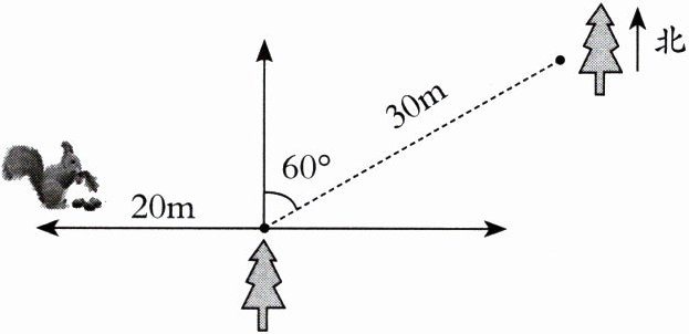小松鼠先向( )走(20)米可以吃到松果,再向( )偏( )($60^\circ$)方向走(30)米还可以吃到松果。