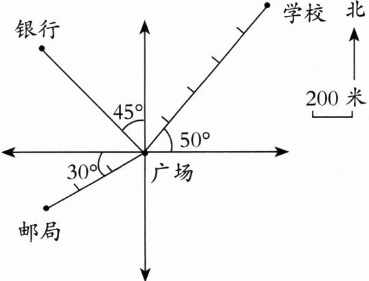 (2)邮局的位置在( )偏( )($30^\circ$)方向上,距离广场( )米处。