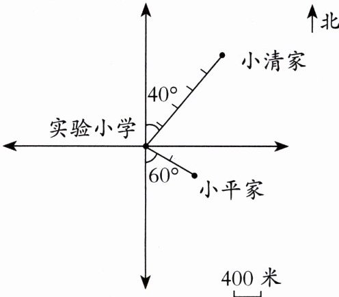 (1)小平家在实验小学的( )偏( )($60^\circ$)方向上,距实验小学( )米处。小清家在实验小学( )偏( )($40^\circ$)方向上,距实验小学( )米处。