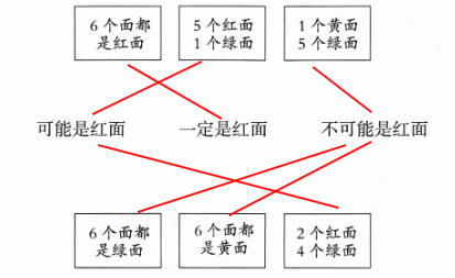 (1)将涂色的正方体任意向上抛,向上的一面会有怎样的结果? 连一连。