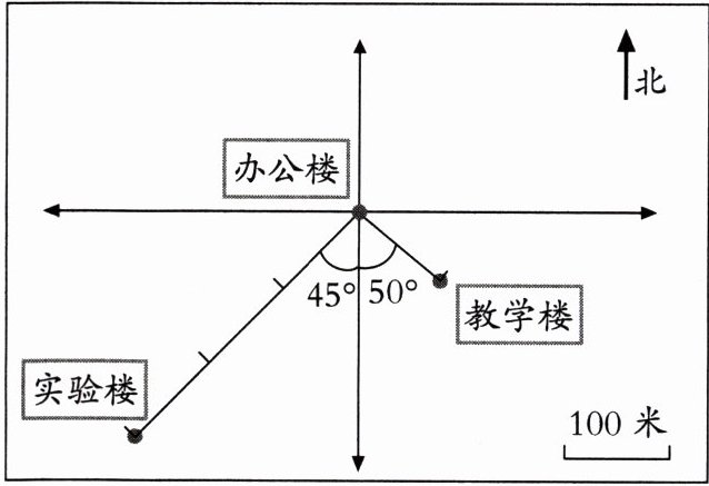 教学楼在办公楼的( )偏( )( )°方向上,距离办公楼( )米。实验楼在办公楼的( )偏( )( )°方向上,距离办公楼( )米。