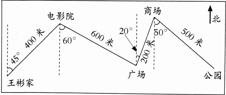 (1)王彬从家到广场的路线:先从家向( )偏( )( )°方向走( )米到电影院,再向( )偏( )( )°方向走( )米到广场。