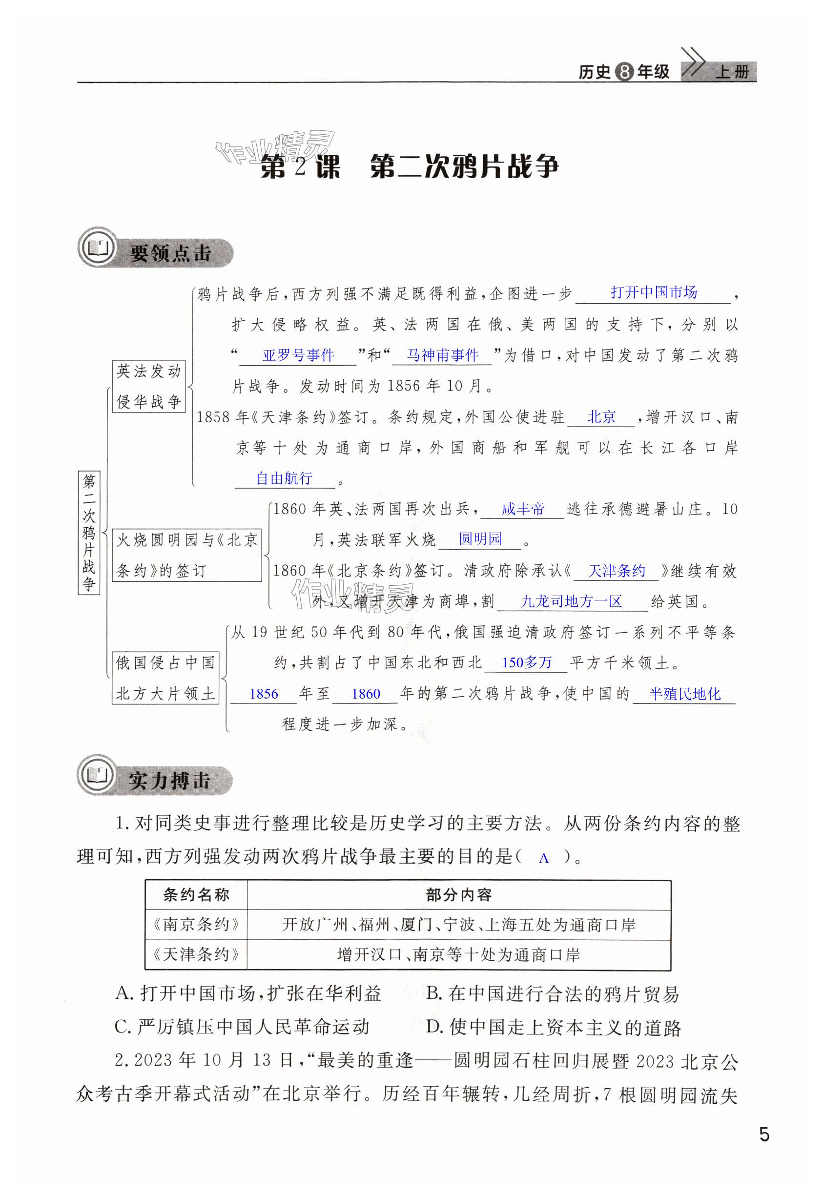 注:目前有些书本章节名称可能整理的还不是很完善,但都是按照顺序排列的,请同学们按照顺序仔细查找。练习册 2024年课堂作业武汉出版社八年级历史上册人教版 答案主要是用来给同学们做完题方便对答案用的,请勿直接抄袭。
