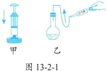 (2)如图13-2-1乙所示,瓶内盛少量水,给瓶内打气,在瓶塞未跳起时,瓶内气体的内能______,这是通过______的方式改变瓶内气体的内能。继续打气,当瓶塞跳起时,观察到瓶口有“白雾”出现。这是因为______对______做功,气体内能______,温度______,瓶中水蒸气遇冷液化成为小水珠。