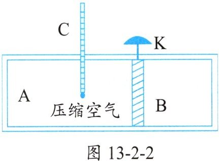 4. 如图13-2-2所示,B是一个被销钉K锁住的活塞,气缸A密封有压缩空气,C是一支温度计。若活塞与气缸壁之间没有摩擦,当把销钉K拔出后温度计C的示数将______(变大/变小/不变)。