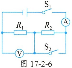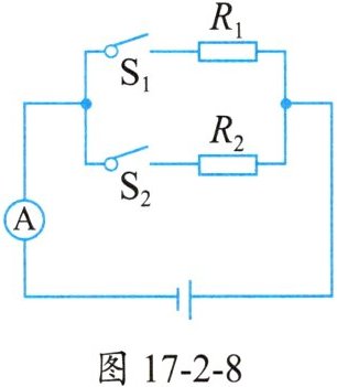 12. 如图17 - 2 - 8所示的电路,电源电压保持不变,电阻$R_{1}$、$R_{2}分别为20\ \Omega和30\ \Omega$,只闭合开关$S_{1}$时,电流表的示数为$0.3\ A$。求: