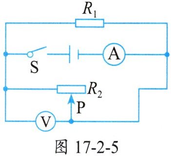 9. 在如图17 - 2 - 5所示的电路中,电源电压保持不变,当开关$S$闭合,滑动变阻器滑片$P$向右移动时,电压表的示数______,电流表的示数______。(变大/不变/变小)