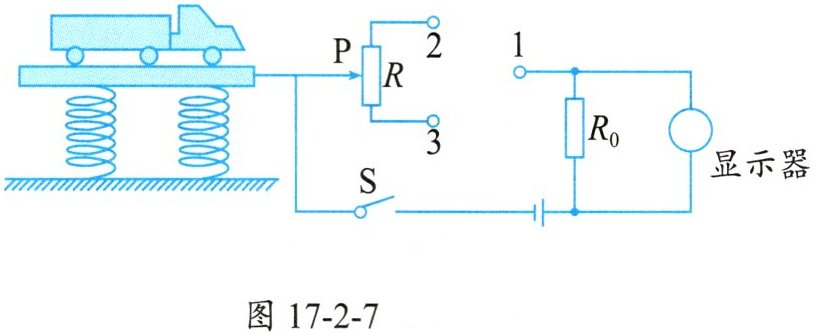 11. 公路检查站的“地磅”可以检测货车是否超载。图17 - 2 - 7是某种地磅的工作原理图,滑片$P可在竖直放置的电阻R$上滑动,当货车质量增大时,电表示数变大,所指示的质量数也增大。则该显示器是由______(电流表/电压表)改装而成的,接线柱“$1$”应与“______”($2/3$)连接。若电路的保护电阻$R_{0}$损坏,工作人员误用了一个较大的电阻,则会导致显示器的结果______(偏大/偏小/不变)。