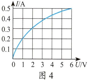 5. 图4为某种灯泡的电流$I与电压U$的关系图像。若有$6只这种灯泡串联接在电压为6V$的电源上,通过灯泡的电流为______$A$;若把一只这种灯泡与一电阻并联接在电压为$6V$的电源上,总电流为$1.5A$,则该电阻的阻值为______$\Omega$。