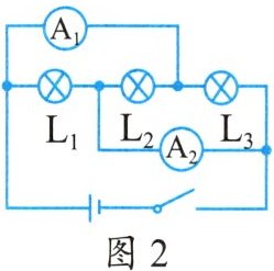 3. 如图2所示电路中,三盏灯之间是______联的,若通过灯$L_{1}$、$L_{2}$、$L_{3}的电流分别为I_{1}$、$I_{2}和I_{3}$,则电流表$A_{1}的示数I_{1}'= $______,电流表$A_{2}的示数I_{2}'= $______。