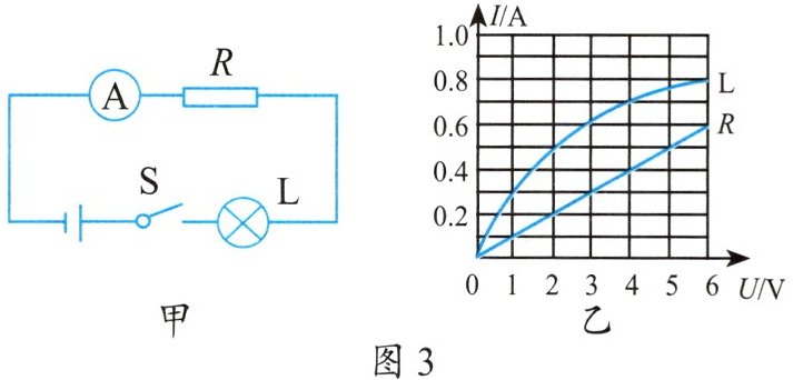 4. 将电阻$R和灯泡L$接在图3甲所示的电路中,电源电压保持不变。图3乙为电阻$R和灯泡L的I-U$图像。闭合开关$S$,电流表的示数为$0.8A$,则电源电压和电阻$R$的大小分别是( )。\nA. $12V$ $7.5\Omega$\nB. $6V$ $10\Omega$\nC. $14V$ $10\Omega$\nD. $14V$ $5\Omega$