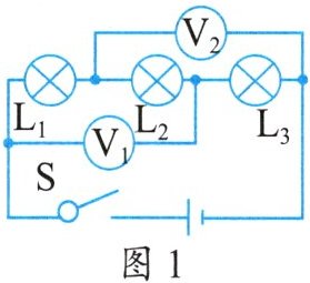 2. 如图1所示电路,当$S$闭合时,电压表$V_{1}的示数为7.5V$,电压表$V_{2}的示数为9V$,若电源电压为$12V$,则灯$L_{1}$、$L_{2}$、$L_{3}$电阻之比为______,两端电压之比为______,通过电流之比为______。